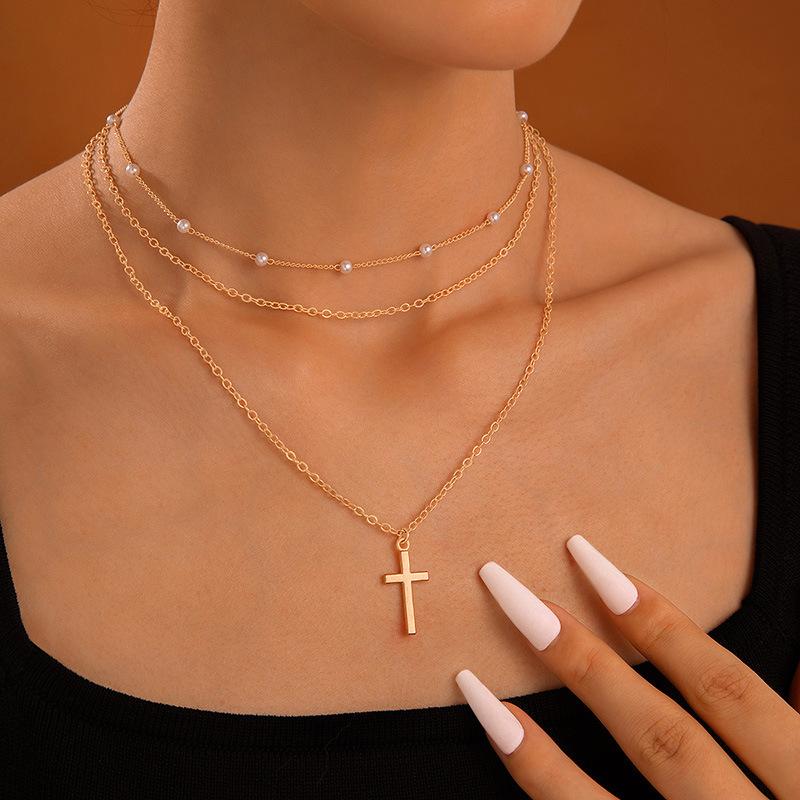 Simple Niche Design Cross Collarbone Chain Neck Chain Geometric Imitation Pearl Retro Stacked Necklace