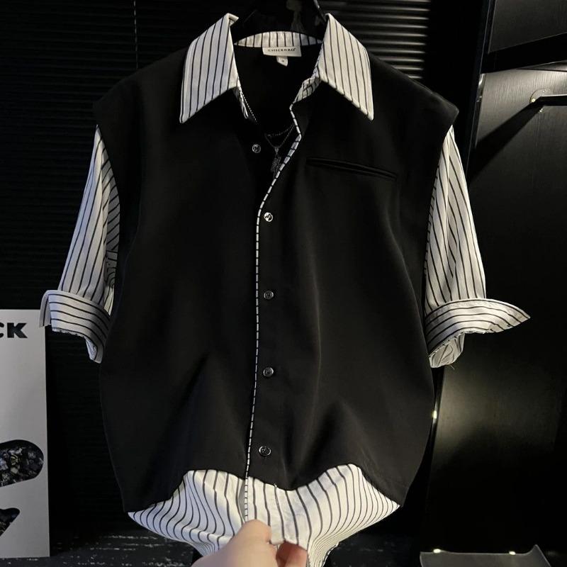 Summer Men's Patchwork Striped New Short-sleeved Shirt Fake Two-piece Design Casual Loose Versatile Shirt