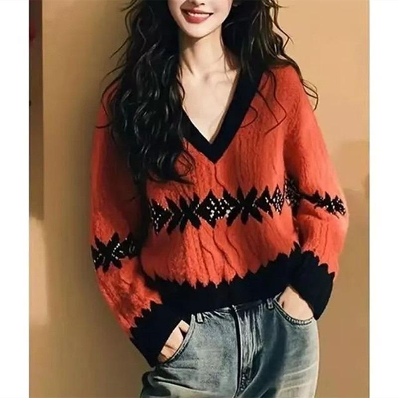Korean Style Autumn and Winter Loose and Lazy Style New Sweater V-neck Color Block High-end Knitwear for Women
