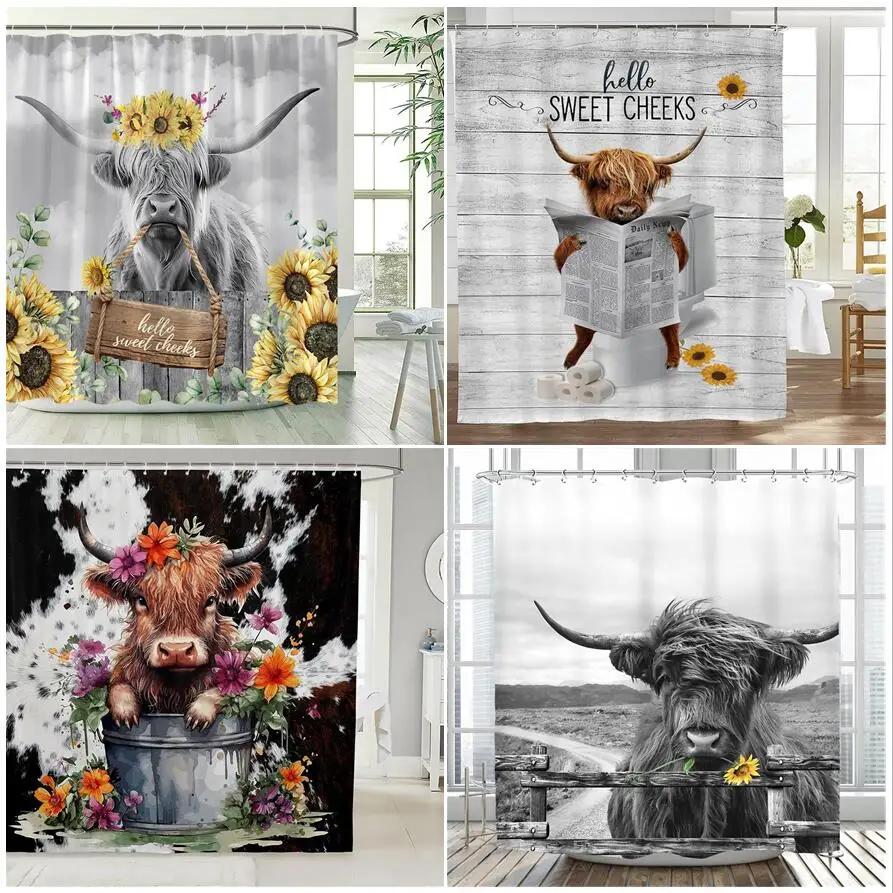 Funny Highland Cow Shower Curtain Farm Animal Sunflower Watercolour Flowers Farmhouse Polyester Fabric Bathroom Decor with Hooks