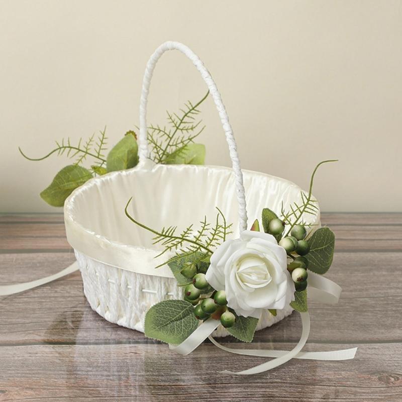 Western Wedding Flowers Basket Small Rattans Woven Basket with Handle for Bride X3UC
