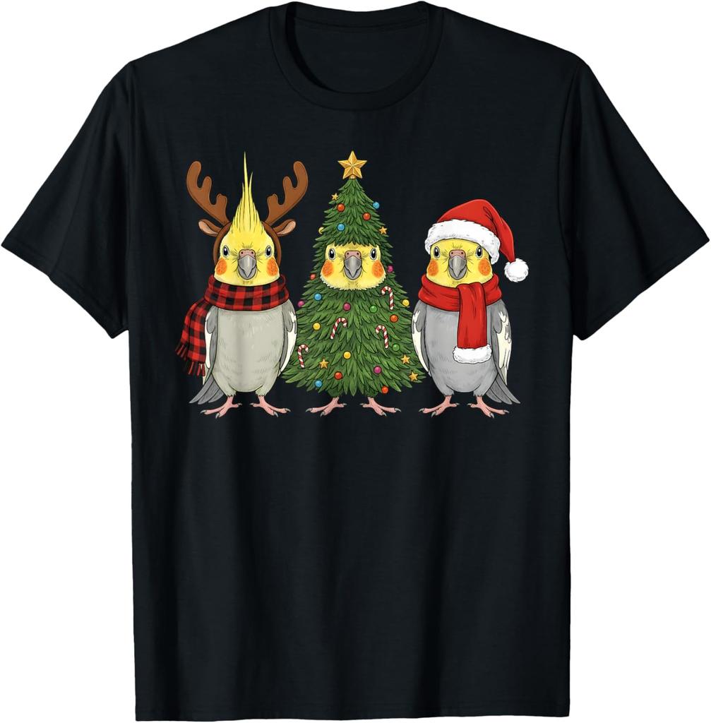 Funny Cockatiel Christmas T-Shirt Santa Reindeer Parrot Graphic Tee Unisex Casual Cotton Print