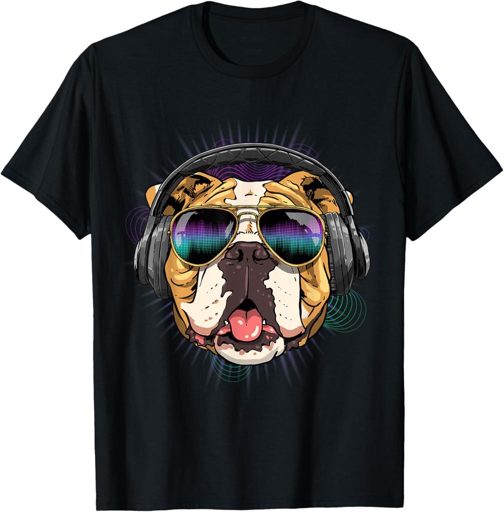 Music Bulldog DJ Headphones Graphic Tee Men Casual Cotton Short Sleeve T-Shirt