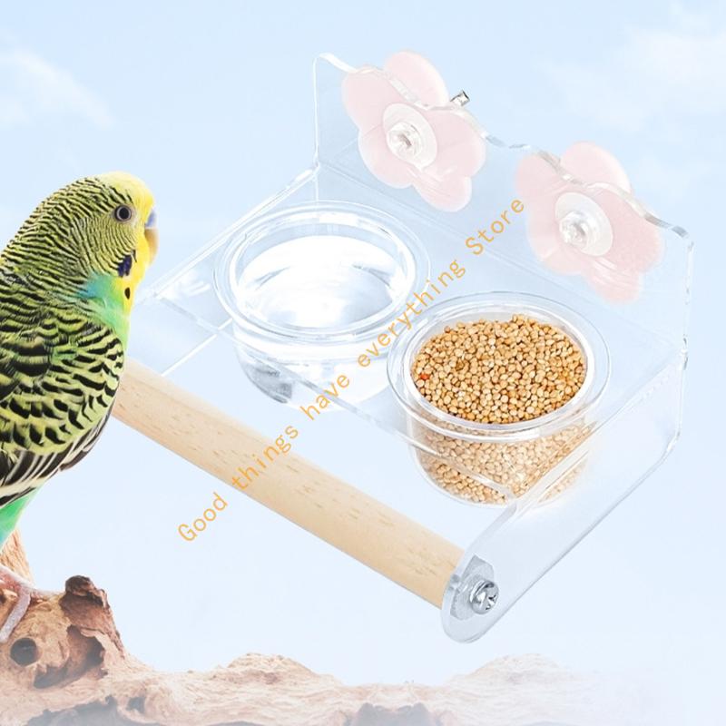 55KF Acrylic Double Feeding Cup Bird Feeder And Water Bowl With Perch Stand For Parrots Cockatiels Lovebirds Cage Accessories