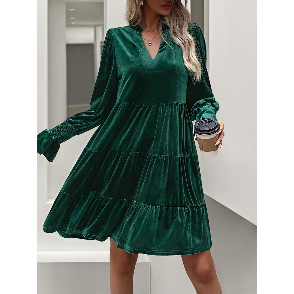 Women's Casual V Neck Long Sleeve Velvet Dress Fall Babydoll Dress Flowy Cocktail Wedding Party Shift Dresses