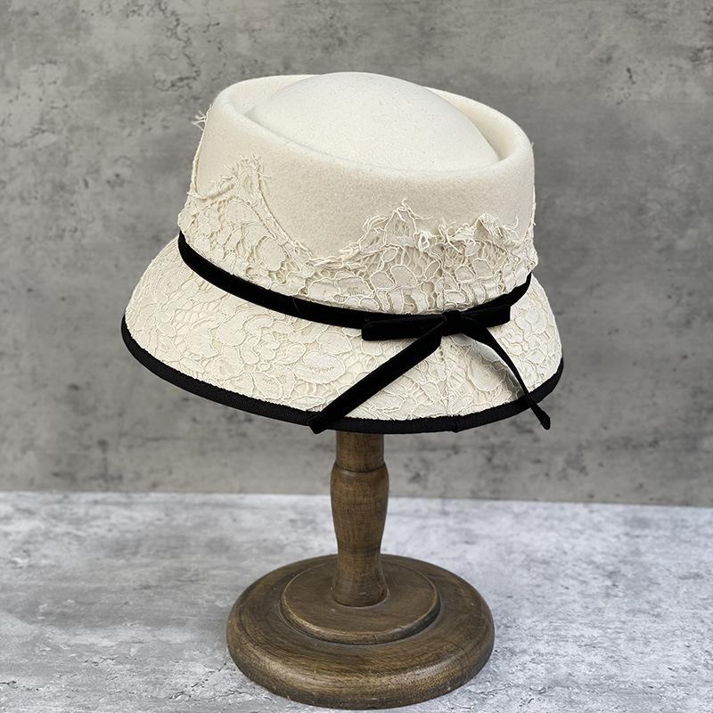 Japanese Retro Elegant Lace Concave Top Celebrity Style Woolen Bucket Hat Women'S Short Brim Basin Hat Felt Hat