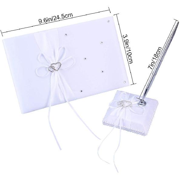Wedding Guest Book and Pen Set Double Heart Rhinestone Decor Signature Book with Pen for Wedding Party Decorations - White
