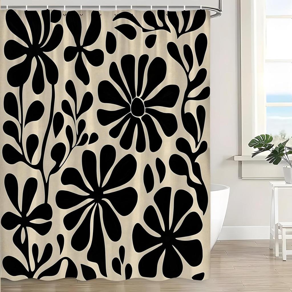 Black Boho Floral Shower Curtain Retro Abstract Flower Leaves Cute Plant Vintage Aesthetic Modern Cool Rustic Mid Century Art Bath Decor Curtain with