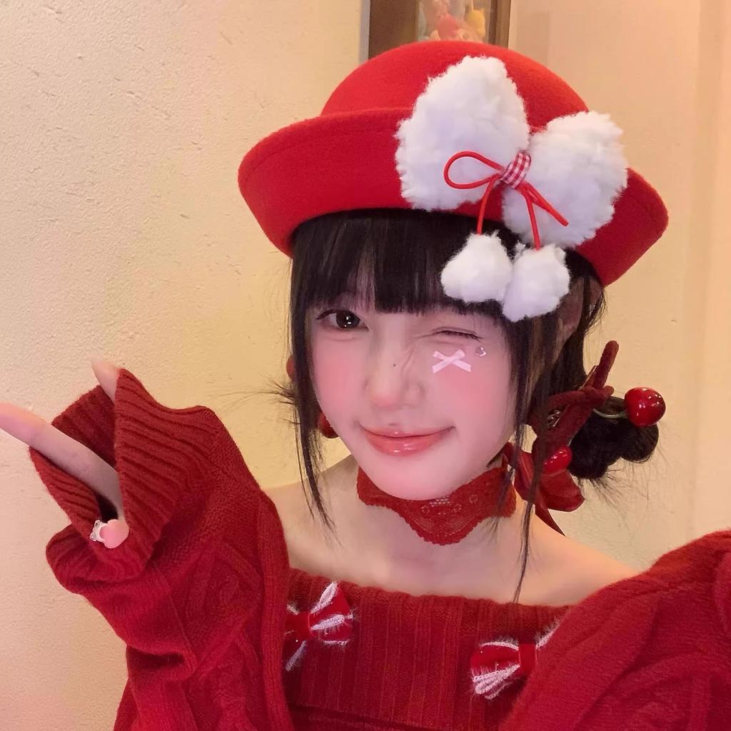 Christmas Red Plush Bow Top Hat 2025 Christmas New Year Painter Hat Ins Wind Bucket Hat