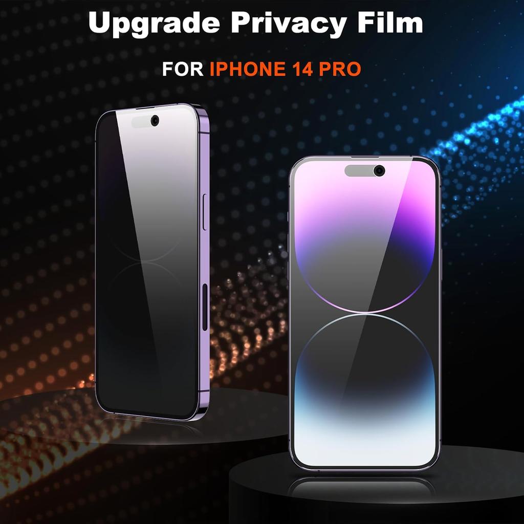 Highty Material: Privacy Glass screen protector made of 9H super strong military explosion-proof glass, and the strengthened edge design ensure the edge of the iPhone 14 Pro Max screen is not easily damaged. Which not only shock-proof, also protecting your screen and lens from scratches to high impact drops.