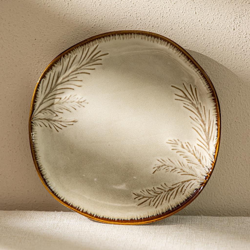 Handmade Relief Branches And Leaves Ceramic Plate Retro Brown Edge Household Vegetable Plate Salad Plate Ramen Plate Japanese Special-Shaped Plate