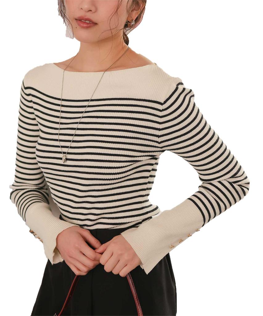 - A boat neck knit with gold buttons on the cuffs as an accent. - The boat neck makes the décolleté look beautiful, which is a nice point. - Made with a high-density ribbed knit fabric that is comfortable to wear and looks high-quality, it has good stretch and is easy to wear. - With a basic silhouette that is easy to coordinate, having one will expand your versatility in how you wear it. - Available in a wide range of colors to find your favorite color.
