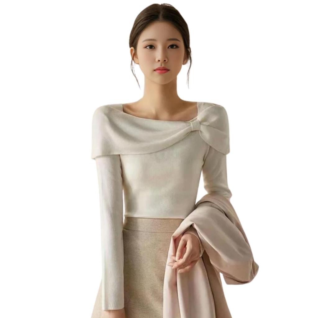 👚 [Lightweight and Fluffy Feminine Knit Top] This soft, delicate, lightweight knit supplely conforms to your skin. The clean and elegant boat neckline with a large ribbon accents the chest area, enhancing your dignified femininity. Enjoy fashion for the new season with this feminine knit that will soothe your soul.