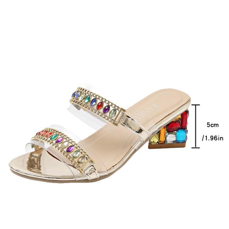 Women's Rhinestone Single Strap Block Heel Sandals, Colorful Sole Mid Heel Summer Shoes, Plus Size