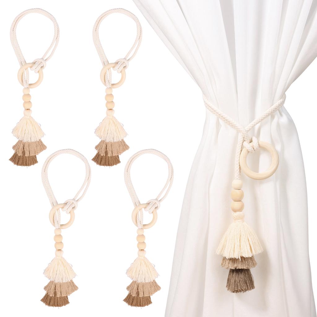 4/6 Pcs Curtain Tiebacks Fringed Wooden Ring Curtain Tieback Bohemian Style Curtains Clasp for Bedrooms Room and Home Decoration