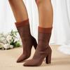 Women's Black Knit Mid-Calf Boots, Pointed Toe Chunky Heel Slim Fit Ankle Boots, Plus Size Fall Winter Footwear
