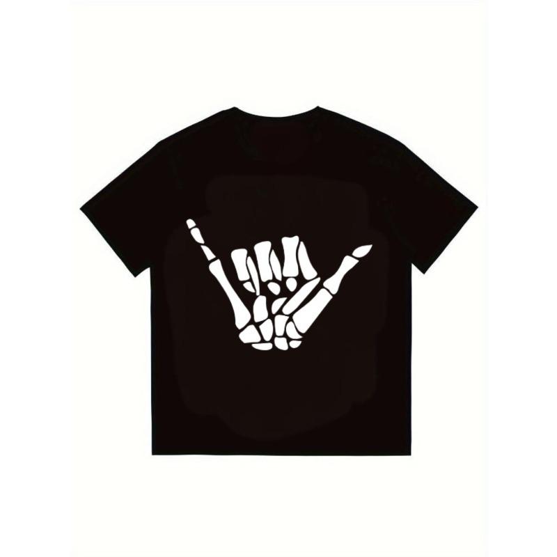 Black Oversized T Shirt With White Skeleton Hand Rock Sign Print Casual Streetwear For Men And Women