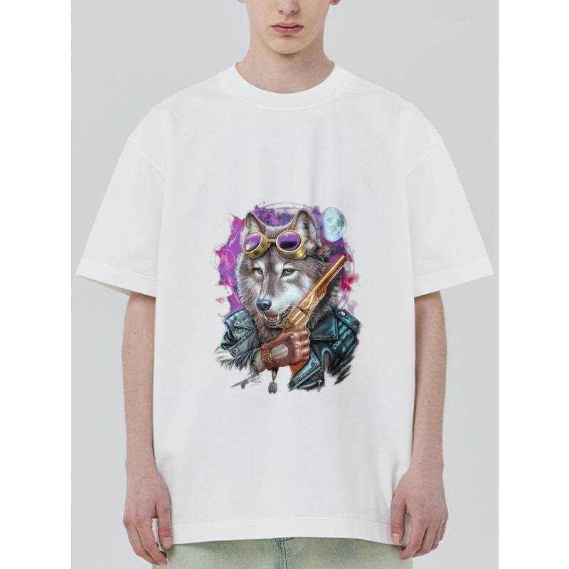 White T Shirt Wolf with Goggles and Gun Graphic Print Casual Streetwear Top for Men and Women