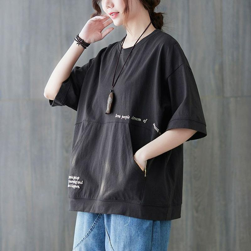 Pure Cotton Pocket Short-sleeved Blouse, Loose Covering Meat, Large Size, Simple Western Style Design, Pullover Women's Summer T-shirt