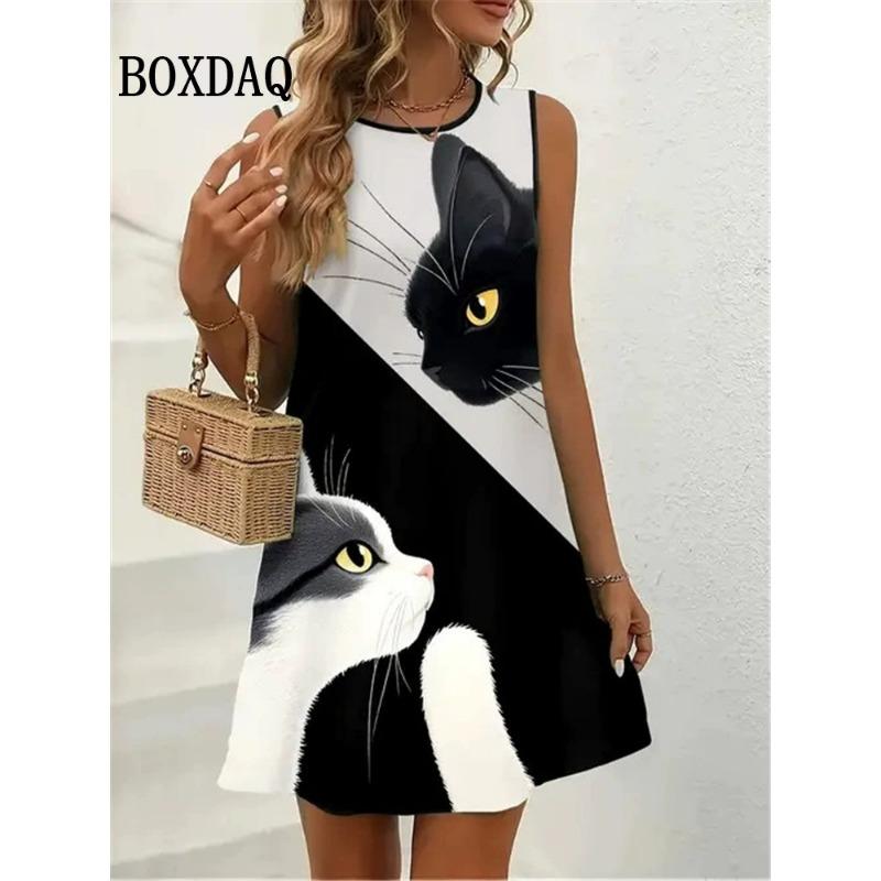 Summer Fashion Cat Pattern 3D Print Dresses Women Casual Sleeveless Flowers Beach Short Dress Sundress Loose Female Vest Dresses