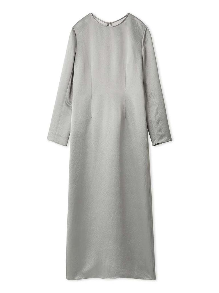 This sophisticated occasion dress is crafted from acetate fabric, boasting a luxurious, silk-like sheen. From the front, it's a simple, long-sleeved dress that hugs the body for a sophisticated look, while the back, made of beautifully sheer tulle, is a bold, sheer piece, creating a dramatic contrast. Precisely because of its simplicity, this dress is packed with attention to detail, from the waistline to the beautiful skirt silhouette, creating a flattering silhouette.