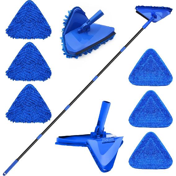 Wall Mop Cleaner Long Handle 80 Inches, 180° Folding Ceiling Washer Scrubber and Squeegee, Triangle Baseboard Cleaning Tool Duster with 6 Microfiber
