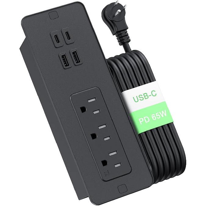 Recessed Power Strip with PD 65W USB C, Flush Mount Power Strip with 3 Outlets 4 USB Ports, Furniture Outlet with 2M Flat Plug Cable for Side Table