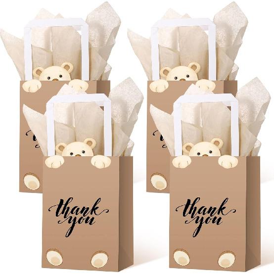Eersida 16 Pcs Teddy Bear Thank You Gift Bags with Tissue Handles Baby Shower Bear Birthday Decorations Thank You Paper Bags Brown Candy Treat