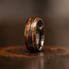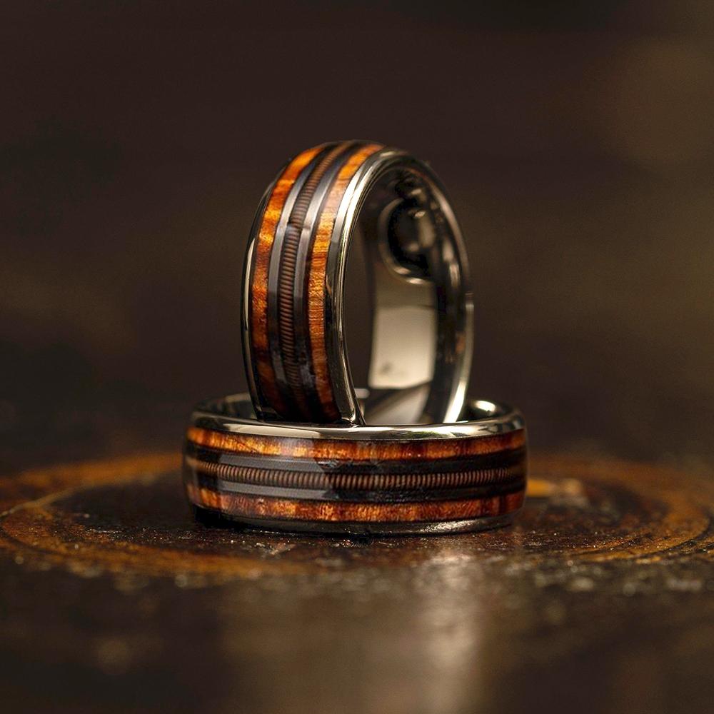 8mm Black Stainless Steel Guitar String Rings for Men Whiskey Barrel Wood Inlay Guitarist Ring Men Wedding Band Jewelry