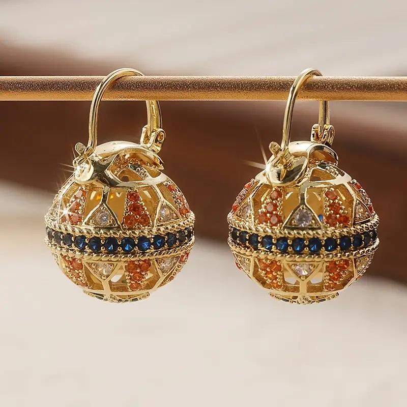 Exquisite Gold Color Round Inlaid with Multicolored Zircon Dangle Earrings for Women Daily Accessory Gifts