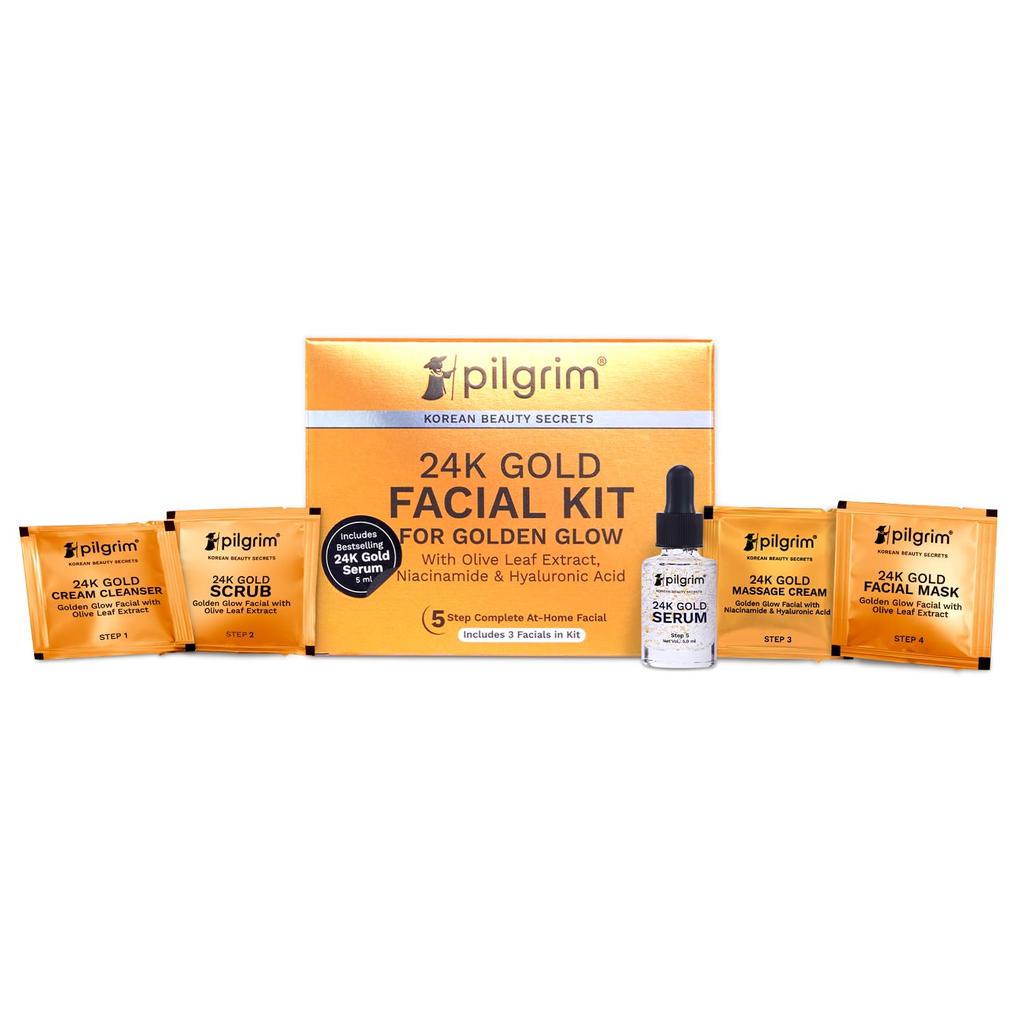Pilgrim 24K Gold Facial Kit For Instant Radiance And Golden Glow With Cleanser Scrub Mask Massage Cream Mist 30 Ml