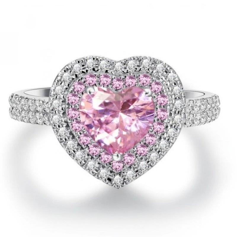 Hot Luxury Heart Shape Pink Silver Color Cute Promise Ring for Women Girl Party Wedding Gift Trendy Jewelry Size 6-11