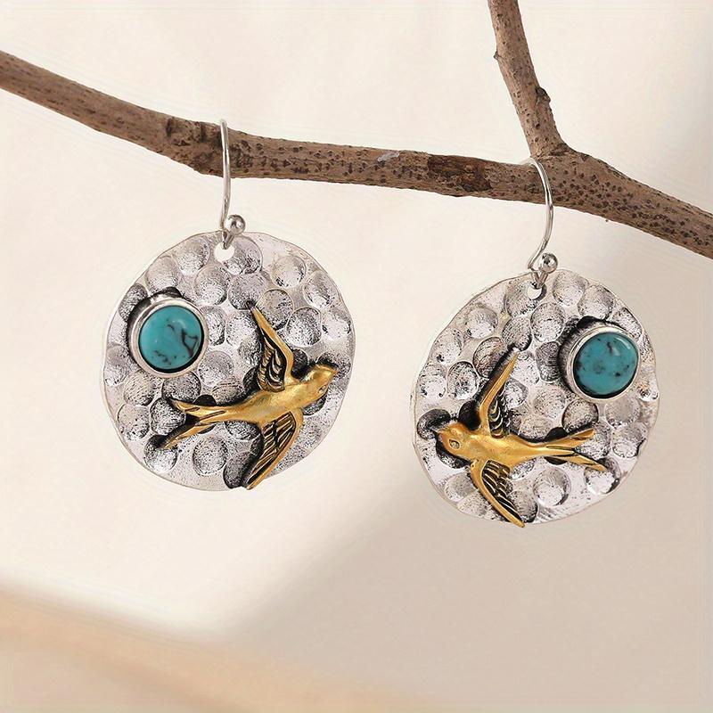 Creative Retro Silvery Disc Shaped Pendant Earrings With Bird Design Earrings For Daily Parties And Personalized Accessories