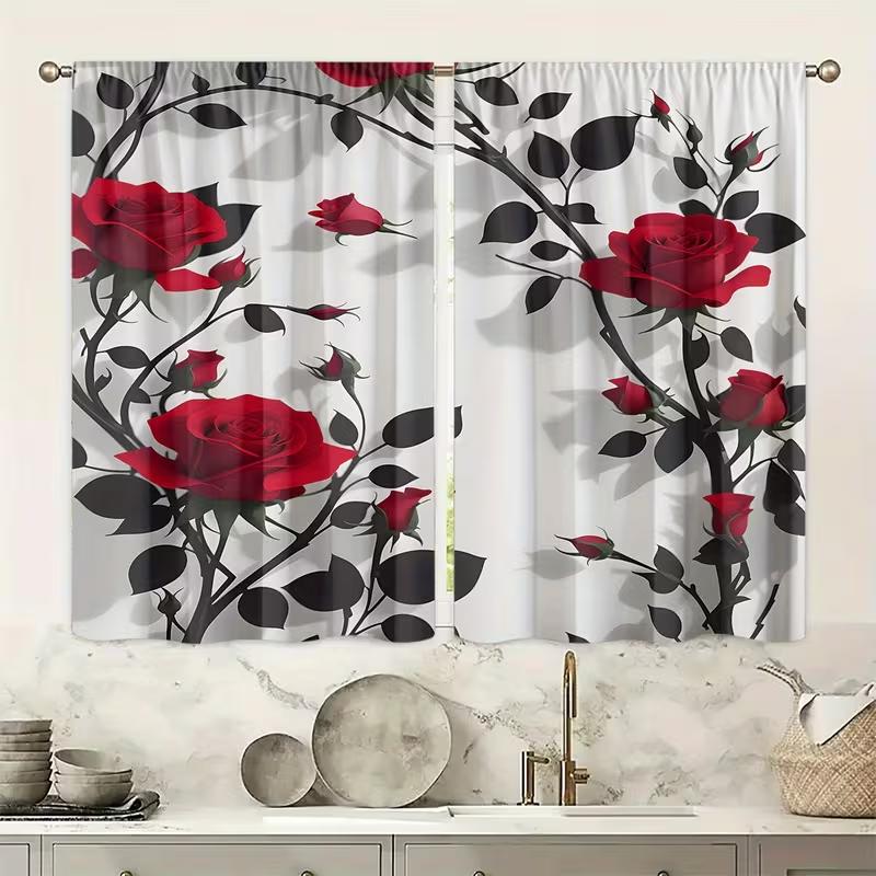 2PC Red Rose Black Branch Curtains Romantic Floral Print Light Filtering Drapes Elegant Modern Home Decor for BedroomLiving Room