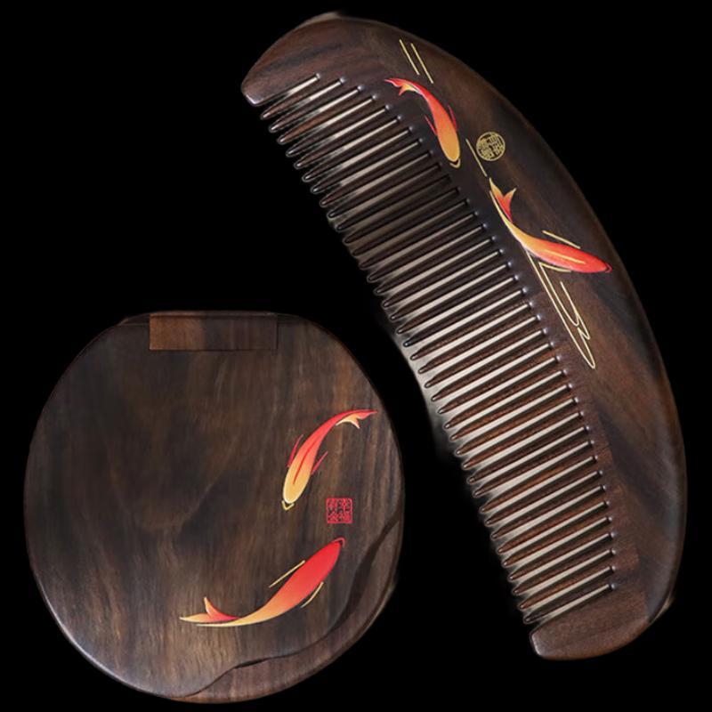 Carpenter Tan Peacock Feather Wooden Comb & Mirror Gift Set