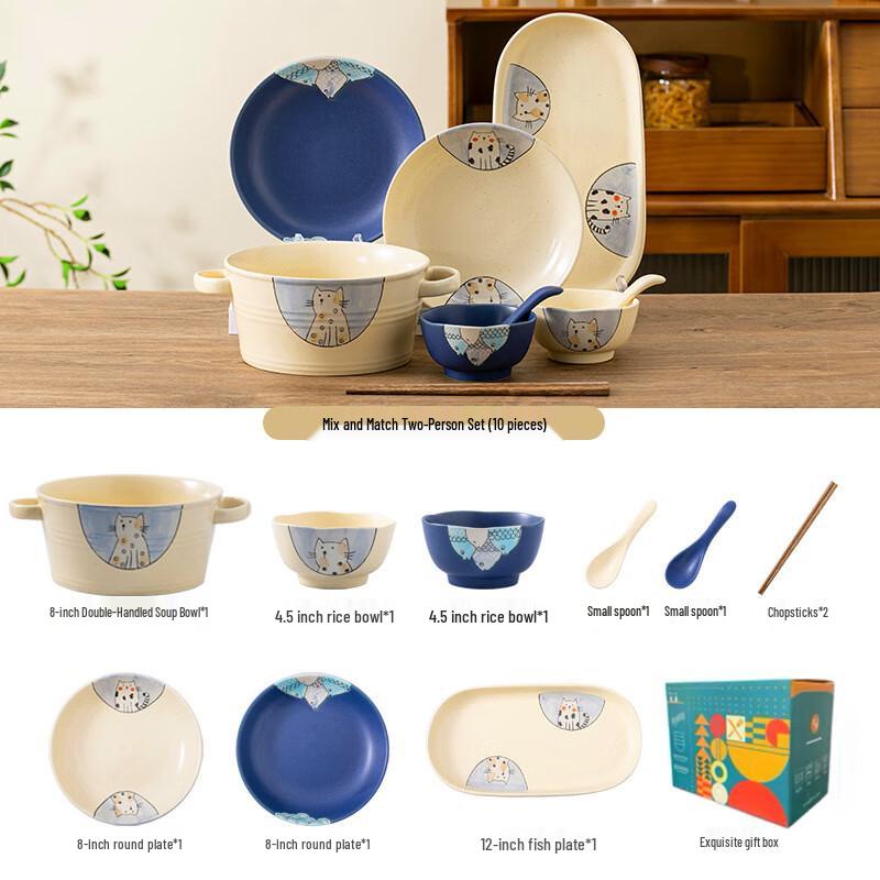 Ailanhui Jia Cute Cat & Fish Japanese Ceramic Dinnerware Set