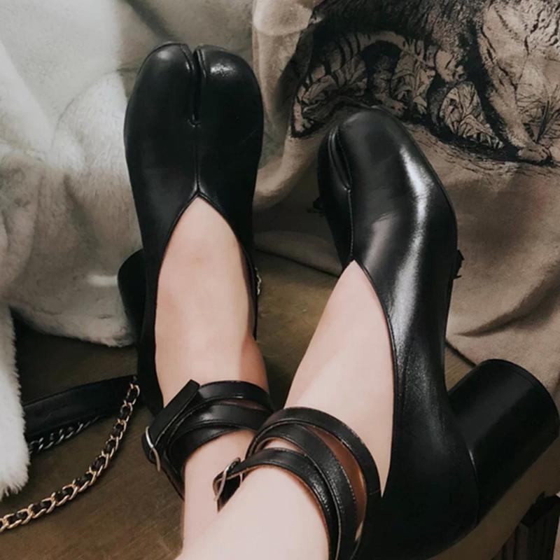 Split Toe Ninja Tabi Pumps Women Ankle Strap Buckle Round Heel High Heels Party Shoes Women Zapatos De Mujer Chaussure Femme