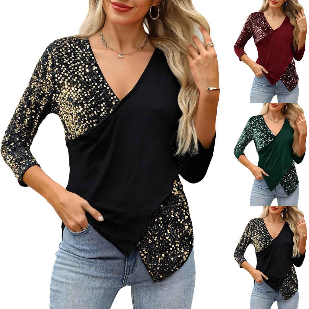 Ladies' Fashionable Casual Sequin Splicing V,neck Hanging Neck Long Sleeved Irregular T,shirt Top