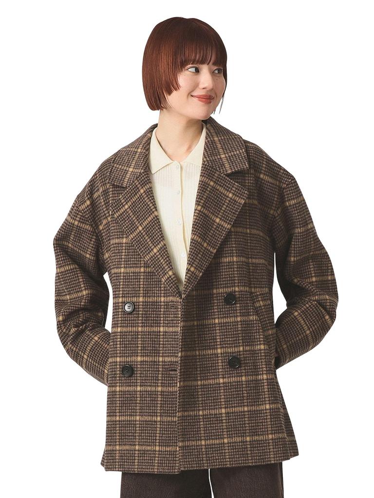 This half coat is crafted from Ray BEAMS' original check fabric. The gray features a glen check pattern, while the brown features a yellow stripe for a rich, expressive look. The cuffs are unadorned and feature a simple, contrasting design. The large collar adds impact, while the wide neckline creates a clean look.