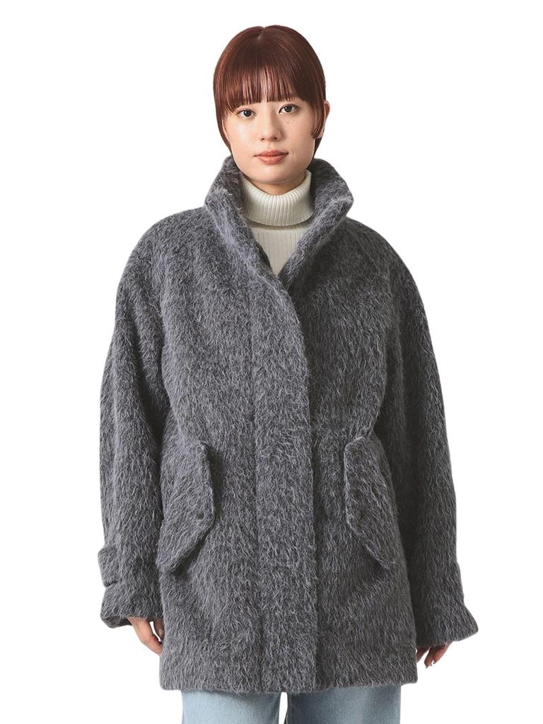 This half coat features a striking, long-pile shaggy fabric. The stand-up collar not only creates a modern look, but also keeps your neck warm from the cold winter wind.
