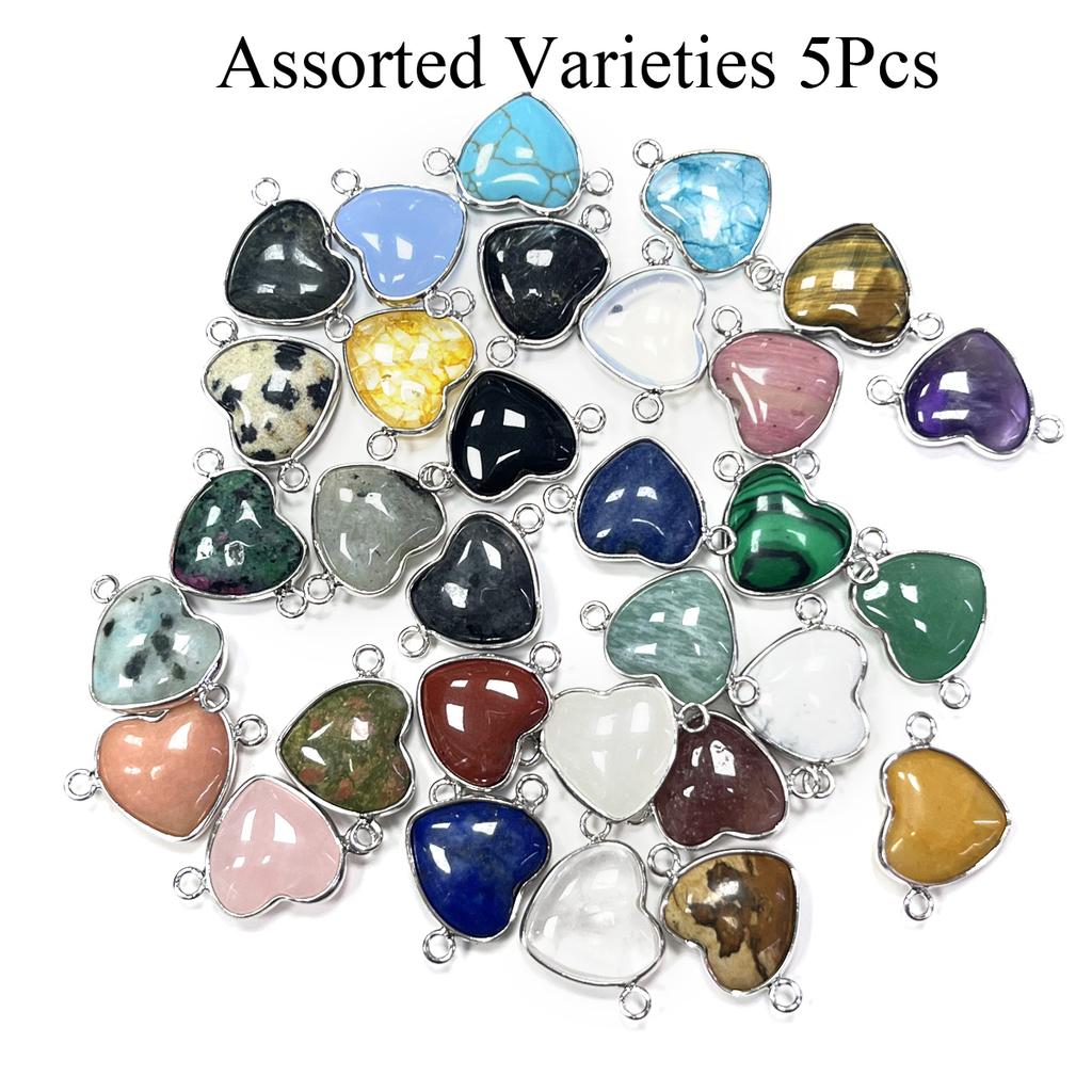 5Pcs/Pack, Healing Crystal Pendant Connectors, Heart-Shaped Natural Stone Quartz Amethyst Malachite Lapis Lazuli Gems Connector for Jewelry Making DIY