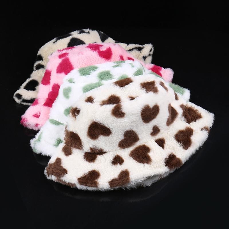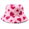 Warm Plush Bucket Caps with Heart Pattern Fashion Winter Autumn Casual Wear Fisherman Hat for Women Girl Outdoor Activity
