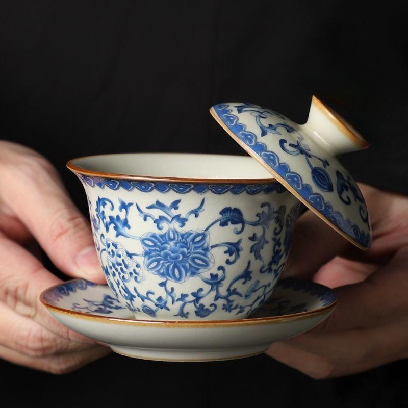 1PC Blue and White Ru Kiln Gongfu Three-piece Covered Bowl Tea Cup Chinese Style Gongfu Tea-making Bowl