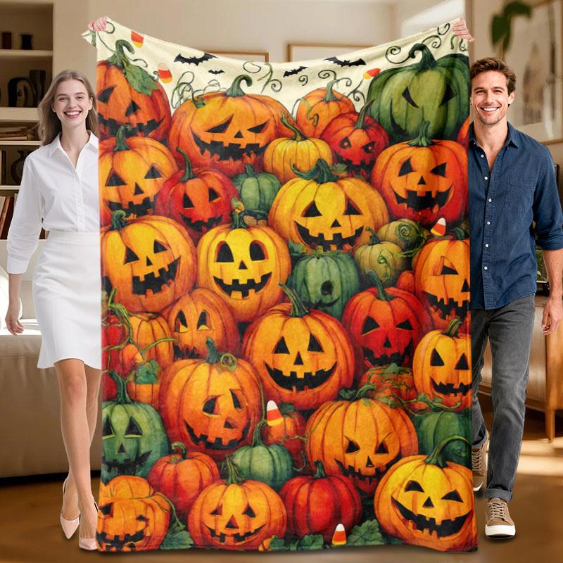1 Piece Halloween Pumpkin Theme, Orange and Green Flannel Blanket, Soft, Suitable for Sofa, Bed, Office, All-season Use.