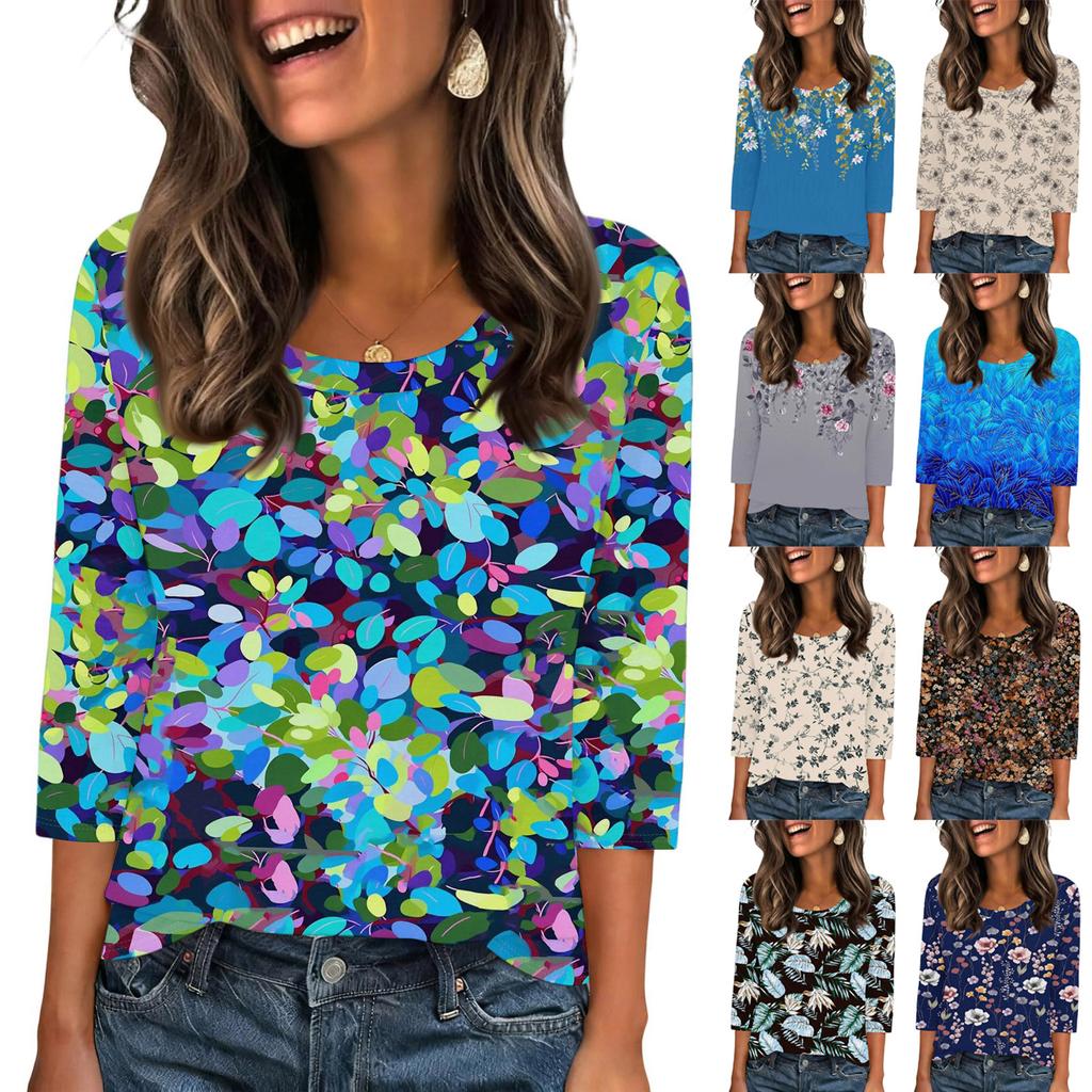 343/4 Sleeve Shirts For Women Cute Print Graphic Tees Blouses Casual Plus Size Basic Tops Pullover