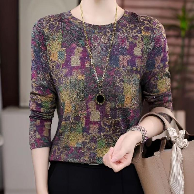 Women's Multicolor Patterned Knit Top Long Sleeve Crew Neck Casual Blouse