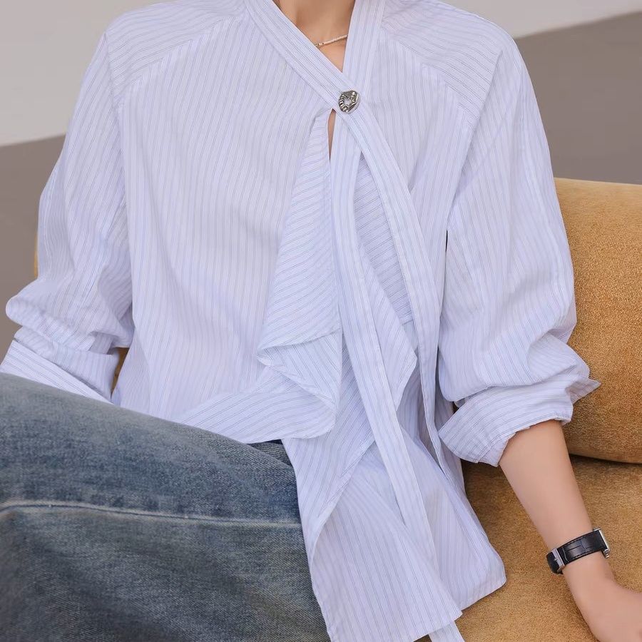 Women's Light Blue Striped Blouse Tie Neck Ruffle Detail Long Sleeve Casual Shirt