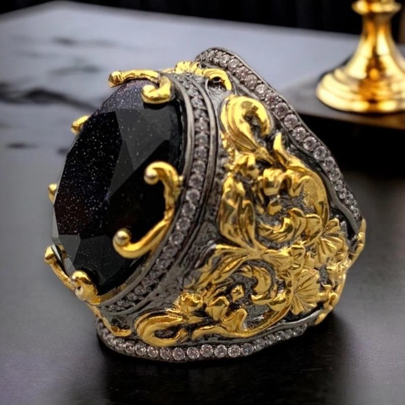 A Men's Egg-shaped Aquamarine Hip-hop Engraved Retro Pattern Ring