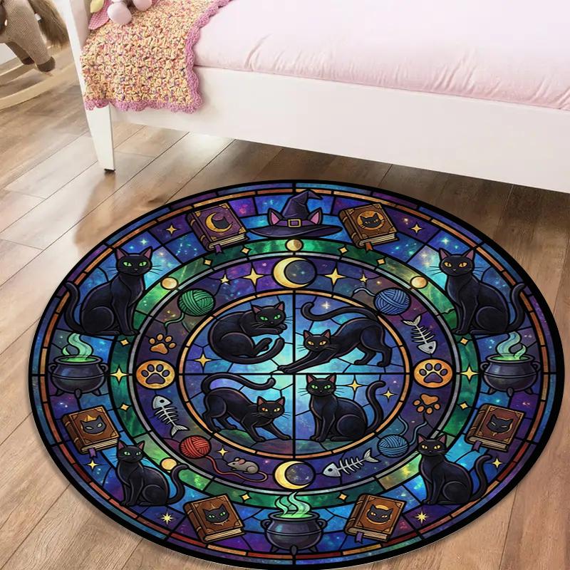 Stained Window Black Cat Round Area Rug,Carpet Rug for Living Room Bedroom Sofa Playroom Decor,Non-slip Floor Mat Q0043