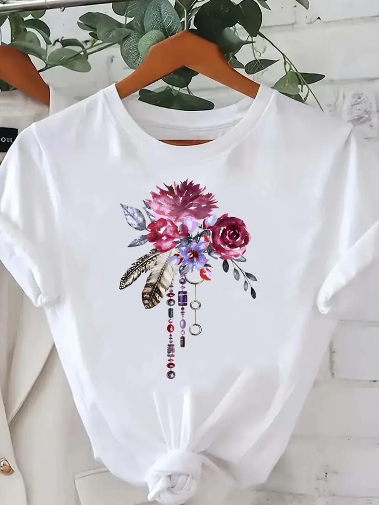 (Asian Size) Tee Lady Female Clothing T Shirt Printed Women Casual Fashion Feather Vintage Trend Top Graphic Short Sleeve T-shirts